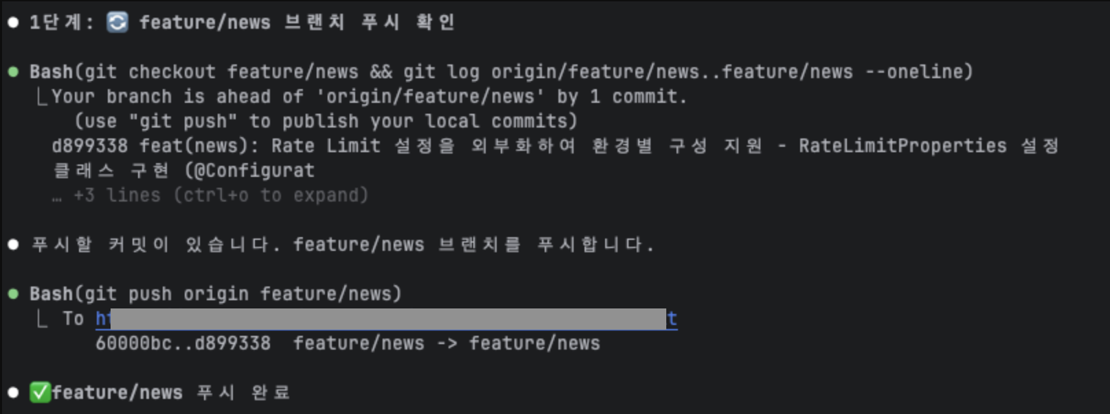 - "작업 브랜치에 푸시할 변경사항이 없습니다. 작업을 종료합니다." 메시지 출력