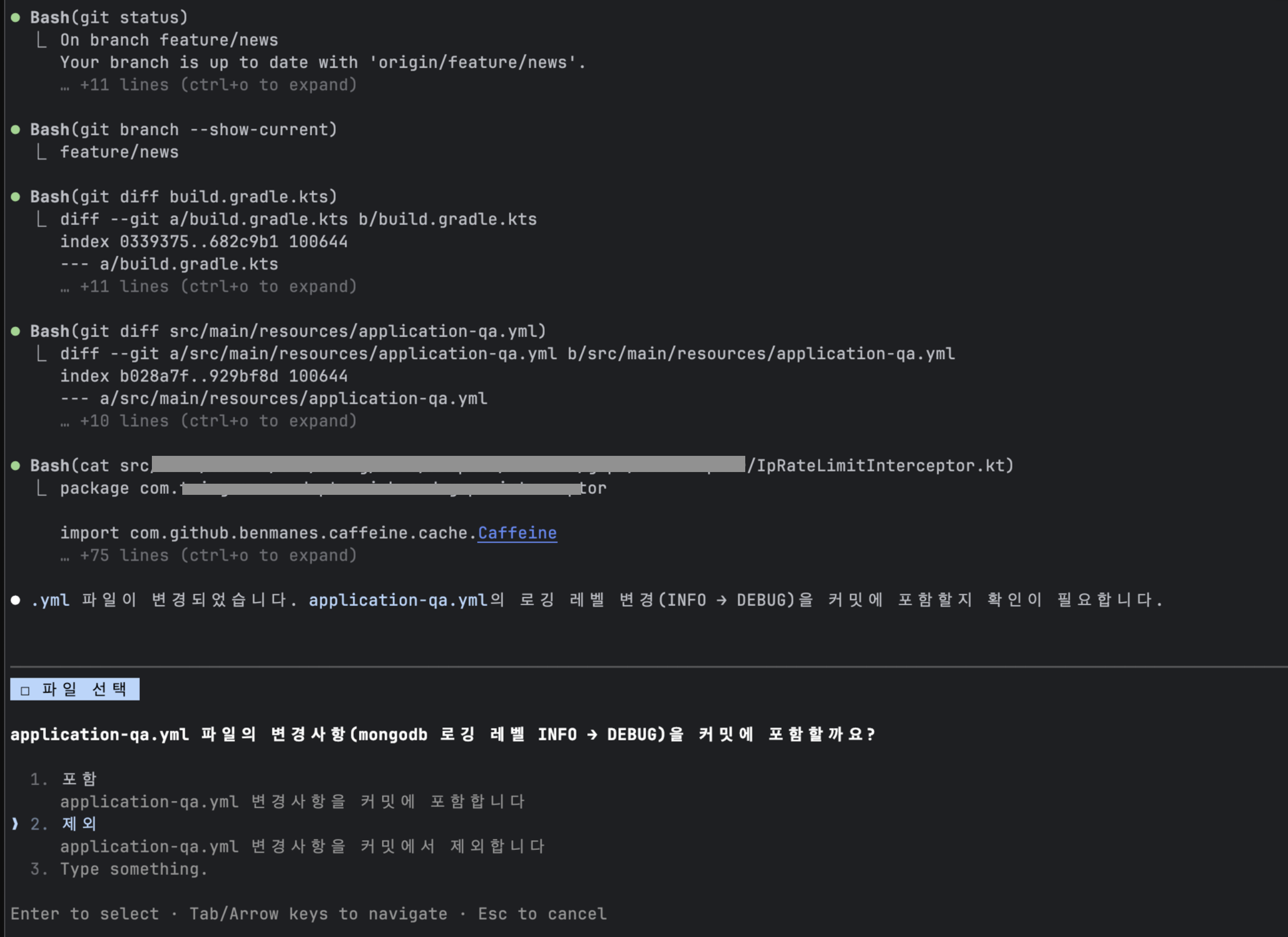 4. **파일 선택 확인**: 변경된 파일 중 `.yml`, `.yaml`, `.xml`, `.log` 파일이 있으면 커밋에 포함할지 사용자에게 질문
