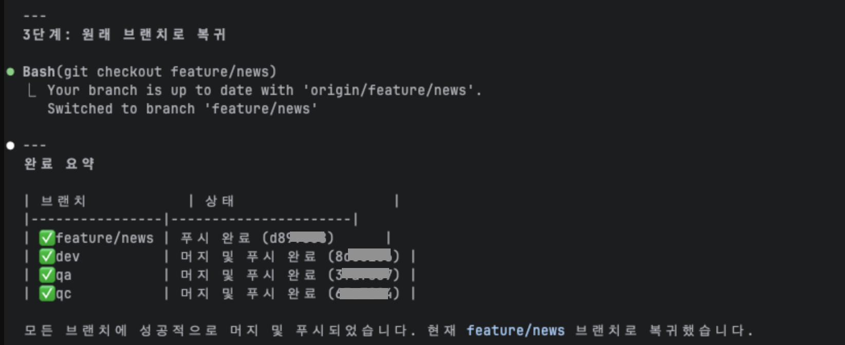 브랜치 확인 → 작업 브랜치 푸시 → dev 머지/빌드/푸시 → qa 머지/빌드/푸시 → qc 머지/빌드/푸시 → 원래 브랜치 복귀